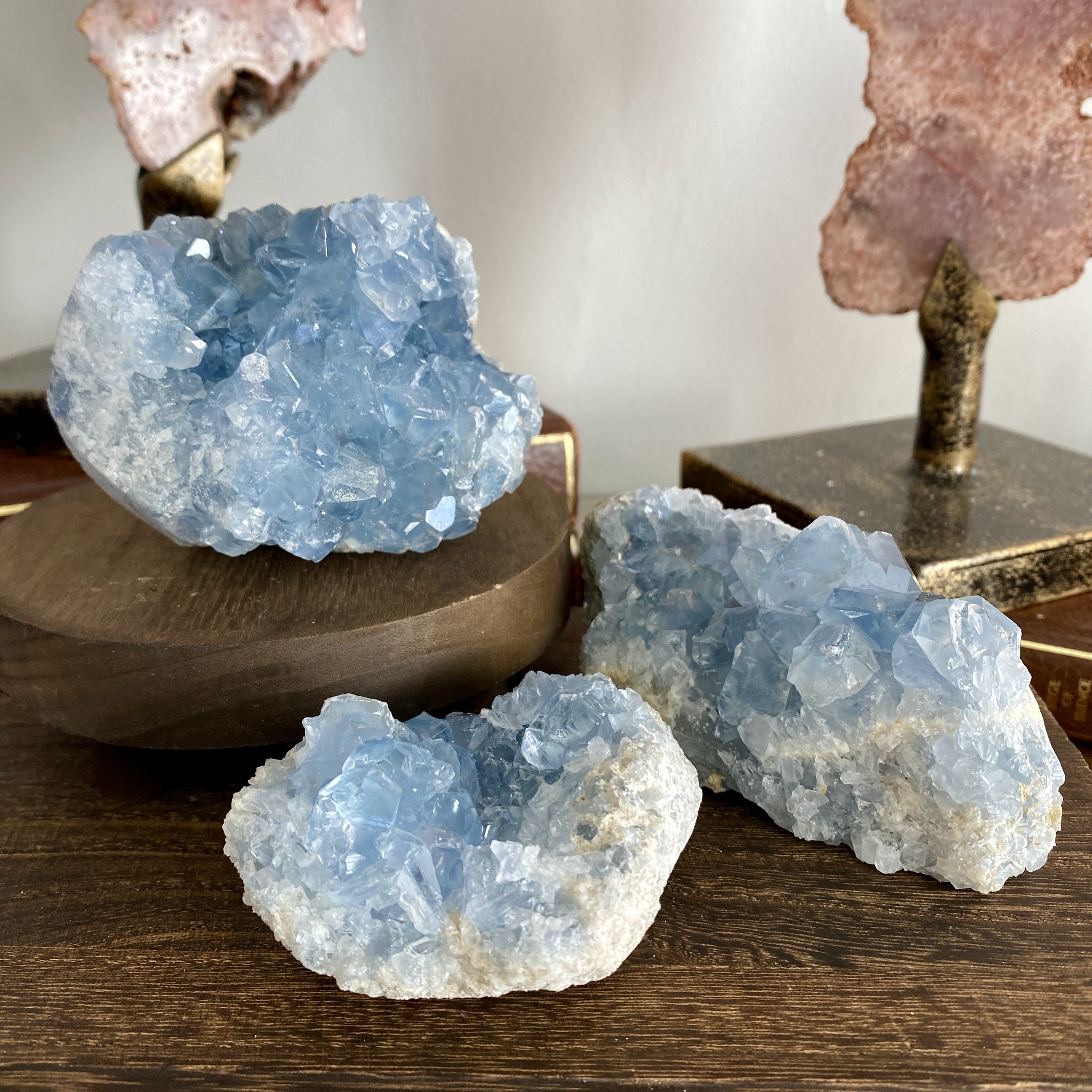 Celestite is also a stone that aids creativity; the process of creation can only occur naturally and effortlessly if we believe in the value of what we create. By calming mental energies and diffusing the energy of trust, Celestite supports overcoming mental barriers, normally self-imposed, that impede our creative flow. Creation manifests first and foremost in our Throat Chakra, as it is this energy centre that is responsible for bringing our ideas into the world through the sound of our voice.