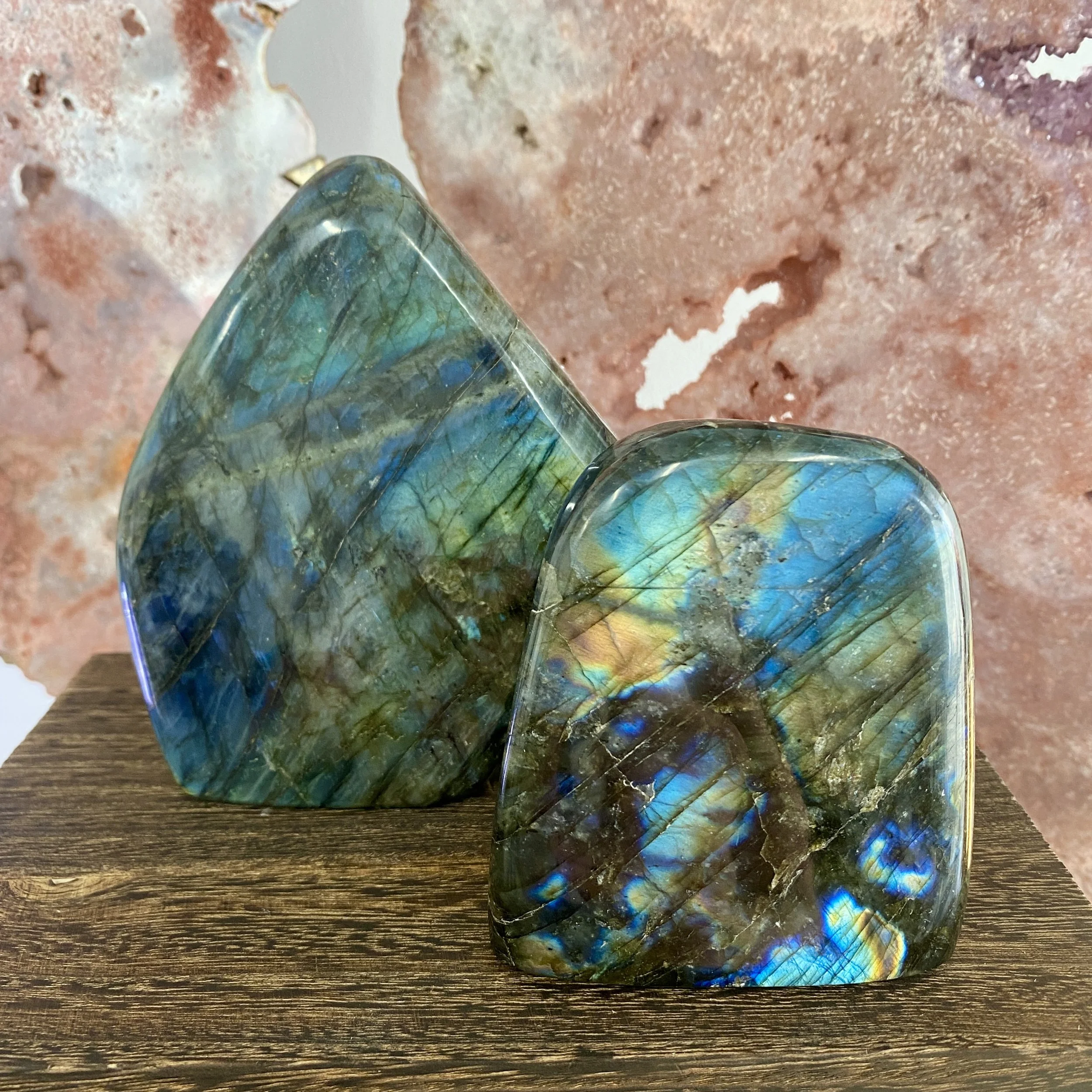 Labradorite in its rough form appears to be a rather dull crystal; however, when the light hits it at the right angle, a rainbow of colours emerges, particularly in a polished piece. A parallel can be drawn with the human condition: if we don’t direct our light of awareness inward, we might miss all of our ‘beautiful colours’. Labradorite is an excellent stone that supports this process.